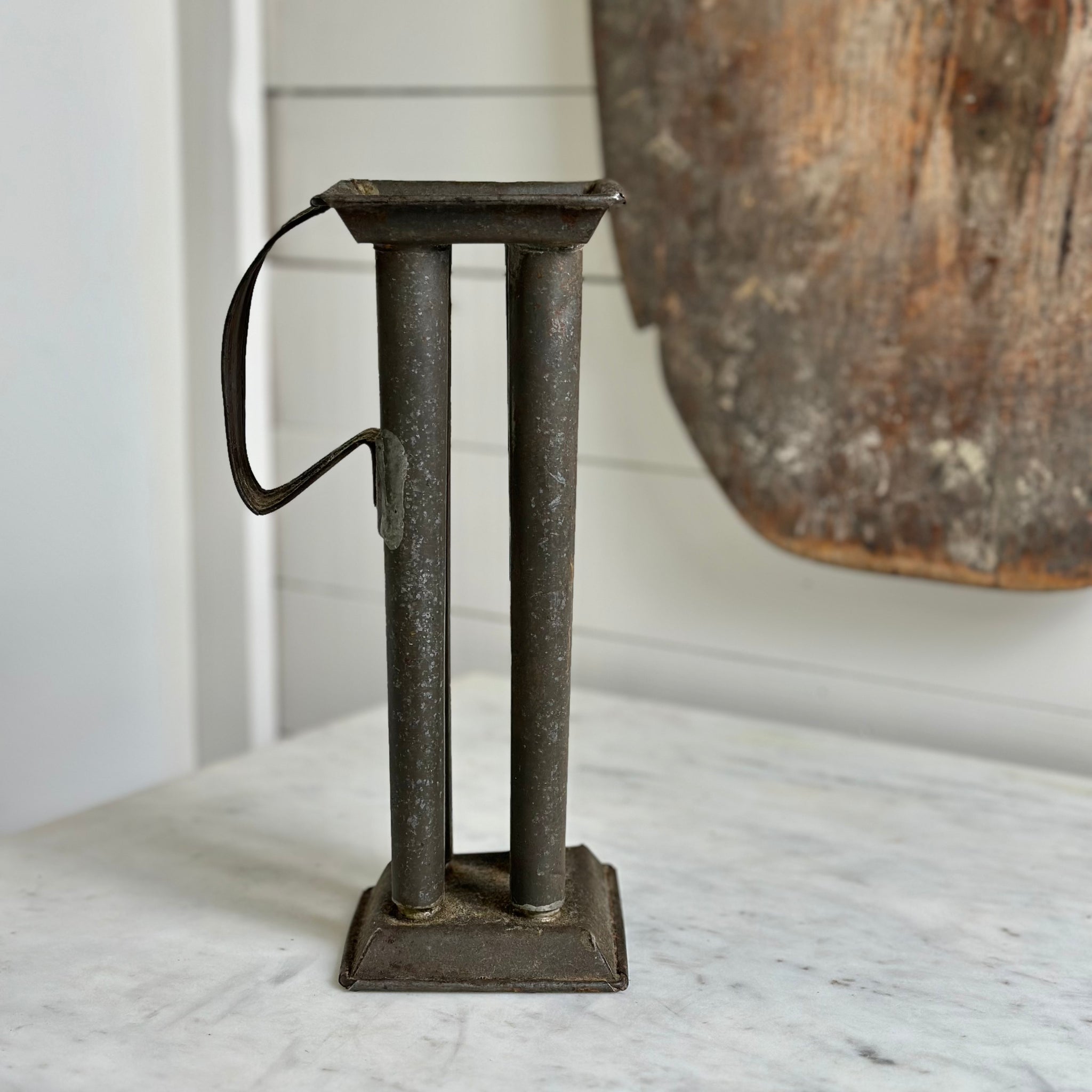 A wonderful antique tin candle mold with timeworn patina and rustic character. Once used for traditional candle making, it now serves beautifully as a decorative accent, vase, or unique styling piece.
