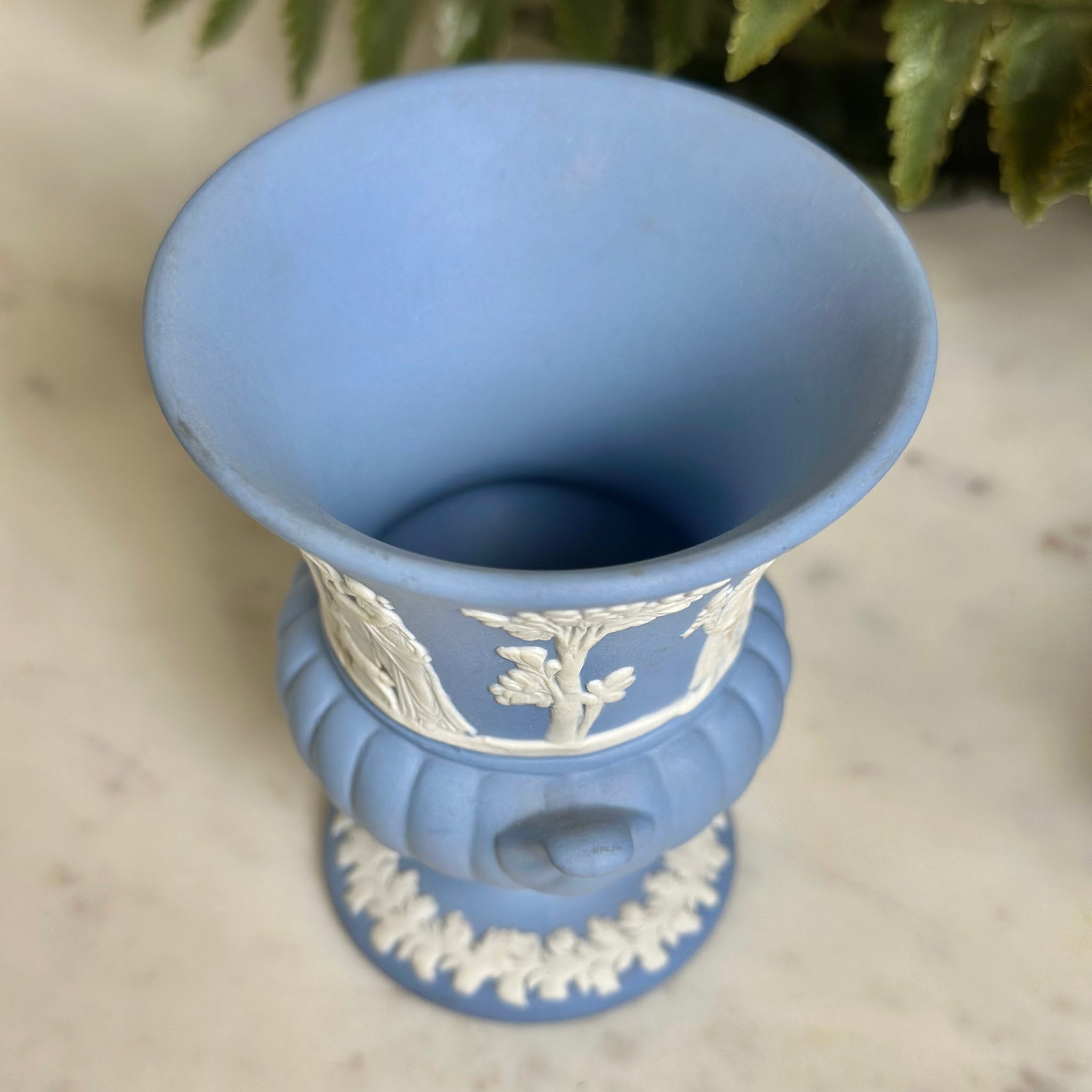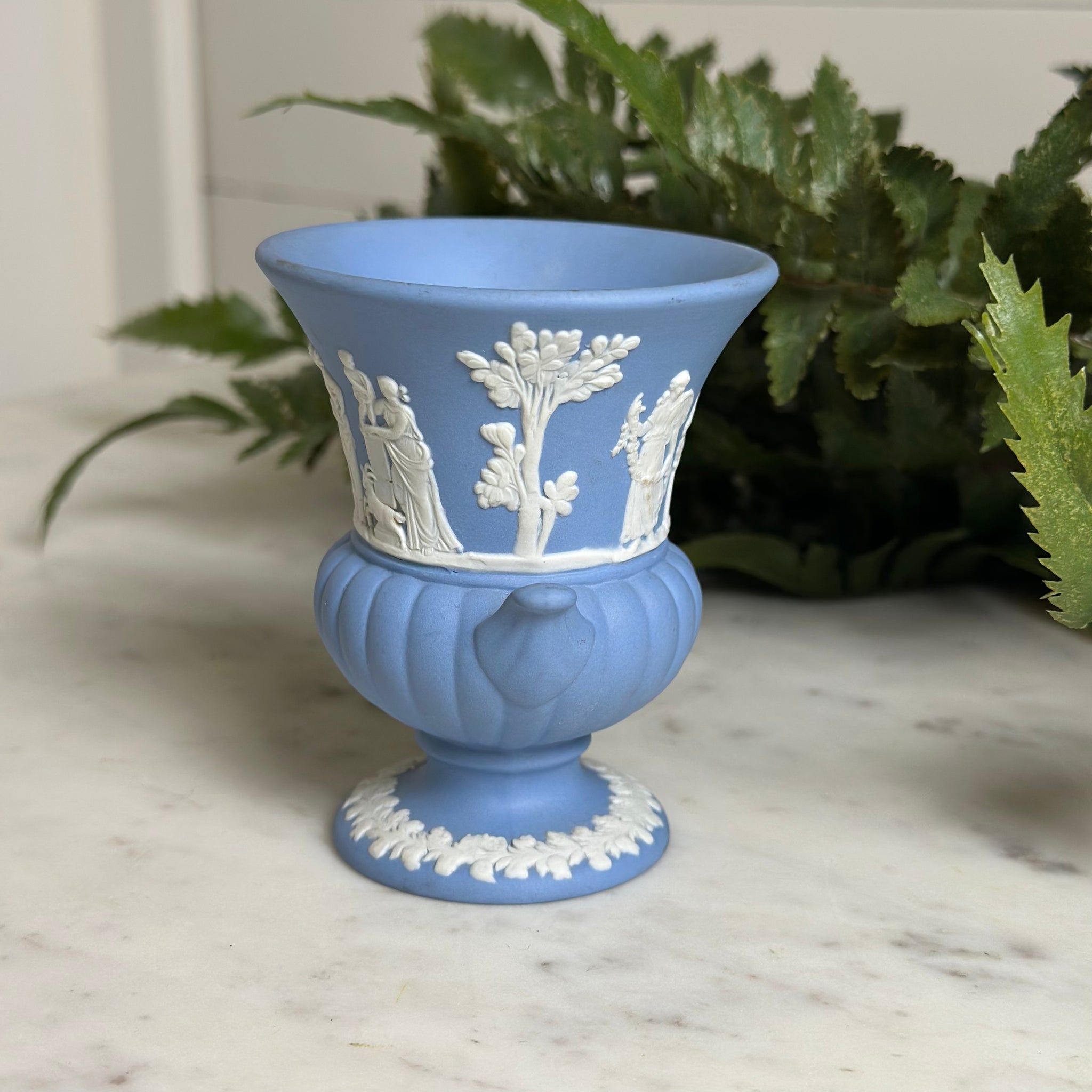 A classic Wedgwood jasperware urn in the iconic soft blue finish, featuring delicate white relief detailing that has made jasperware instantly recognizable for centuries. Timeless and elegant, it makes a beautiful decorative accent for shelves, mantels, or layered vignettes.