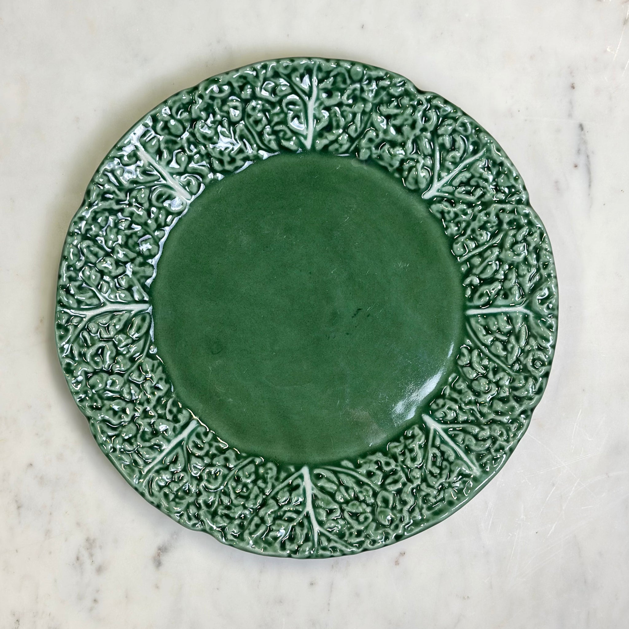 A classic vintage Bordallo Pinheiro cabbage dinner plate, known for its richly detailed leaf design and playful yet elegant character. Full of texture and charm, this piece works beautifully for table settings or as a decorative accent layered into a display.